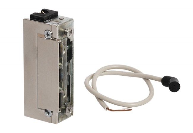 Elektrozaczep pozostaje zamknięty bez zasilania - otwiera się po podaniu napięcia (fail-secure).