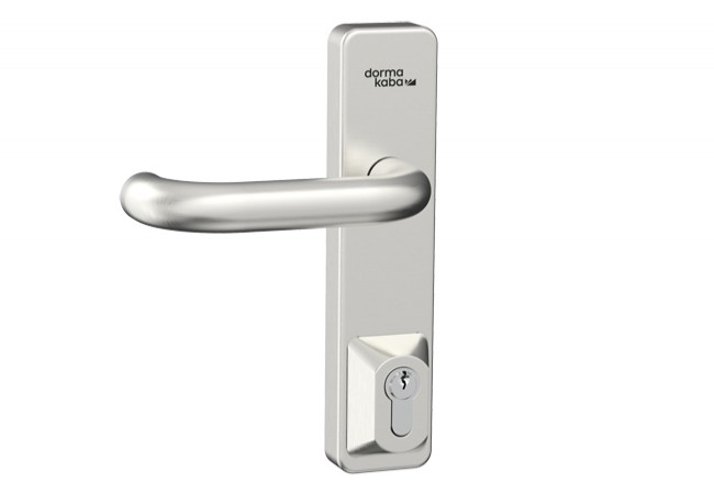 Opis - Klamka dormakaba PHT 10 z wkładką do dźwigni antypanicznej PHA 1102/1202, drzwi o grubości 40-50 mm, srebrna