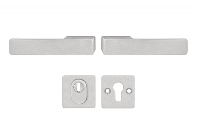 Opis - Klamka z szyldem ukrytym Axa LIBERA z rozetą WB i zabezpieczeniem wkładki FLEX (p.poż.), klasa 3, kolor F6 - stal nierdzewna