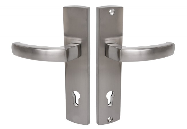 Klamka na podłużnym szyldzie, pokrytym niklem o wykończeniu satynowym.Idealna do drzwi zewnętrznych.Wysokość szyldu wynosi 234mm.Klamka posiada rozstaw 92mm.