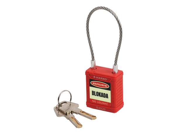 Kłódka bezpieczeństwa B-Harko Lockout z regulowaną linką fi 3,2×150 mm, 2 klucze KD System, czerwona