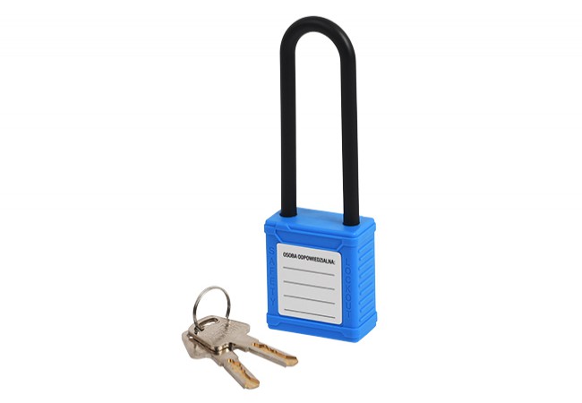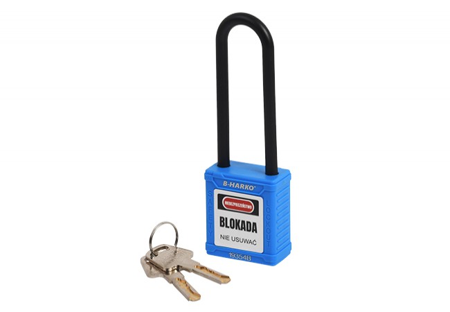 Kłódka bezpieczeństwa B-Harko Lockout z tworzywowym długim pałąkiem fi 6×78 mm, 2 klucze KD System, niebieska