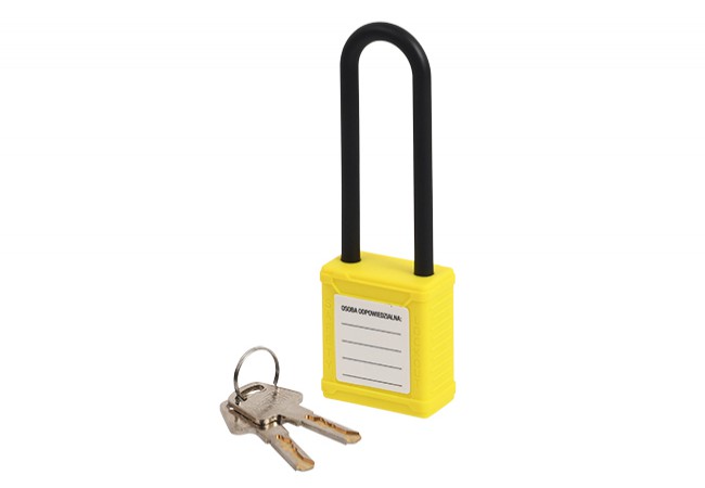 Kłódka bezpieczeństwa B-Harko Lockout z tworzywowym długim pałąkiem fi 6×78 mm, 2 klucze KD System, żółta