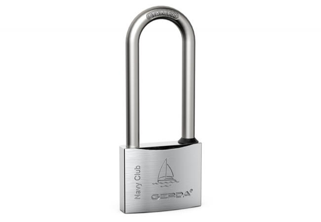 Opis - Kłódka pałąkowa Gerda NAVY CLUB (KCNP) 50mm z wydlużonym pałąkiem (H80), stal nierdzewna, blister