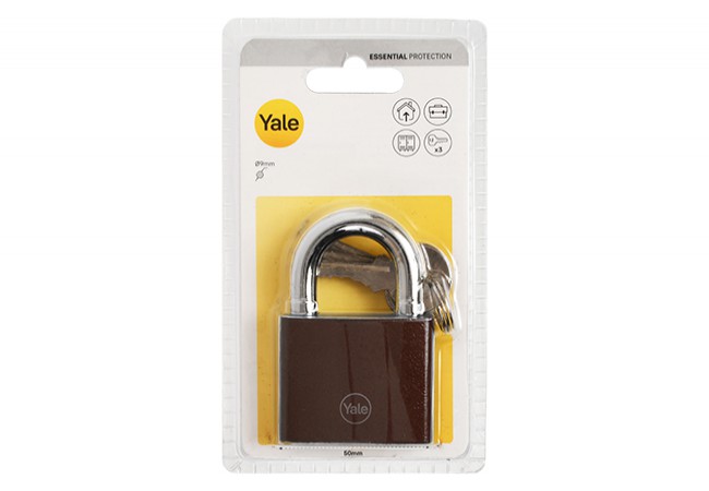 Opis - Kłódka pałąkowa żeliwna zatrzaskowa YALE YE11BR/50/128/1 brązowa 50mm blister