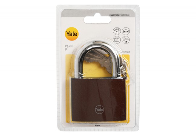 Opis - Kłódka pałąkowa żeliwna zatrzaskowa YALE YE11BR/60/132/1 brązowa 60mm blister