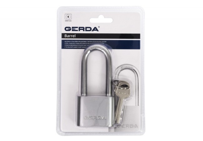 Opis - Kłódka stalowa GERDA Barrel 30mm z wydłużonym pałąkiem 42mm, blister