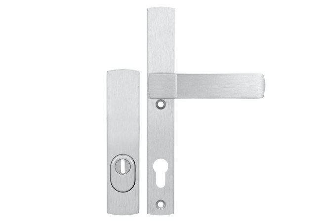 Wąski, nie rzucający się w oczy szyld od strony zewnętrznej połączony jest przelotowo z klamką od strony wewnętrznej.