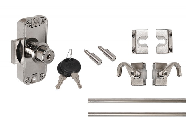 Zamek baskwilowy niklowany polecany między innymi do szafek bagażowych. W komplecie zamek (wkładka 16.5mm), rozeta, elementy montażowe, sztanga i 2 klucze.