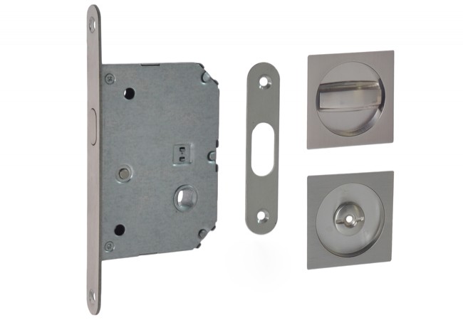 Zamek WC do drzwi przesuwnych z uchwytem kwadratowym 55x55 mm satyna
