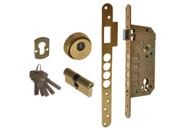 Zamek drzwiowy bolcowy wpuszczany, do drzwi drewnianych, model 101 ze zestawem akcesoriów