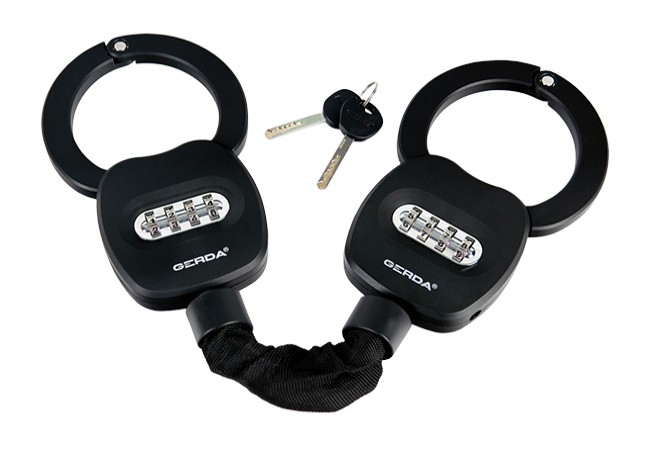 Opis - Zapięcie kajdanowe GERDA E-SCOOTER CUFF 480/75U na 4 cyfrowy szyfr z funkcją awaryjnego przywracania kodu otwierania za pomocą klucza, czarny