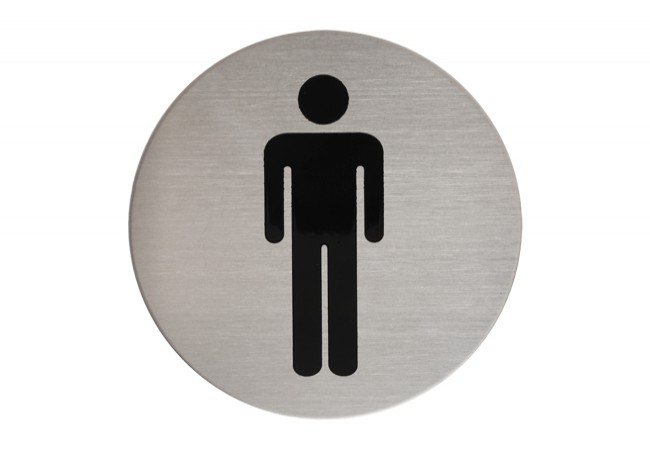 Opis - Znak na drzwi WC MĘŻCZYZNA okrągły samoprzylepny 3M fi 70 mm x 1 mm, stal nierdzewna 304